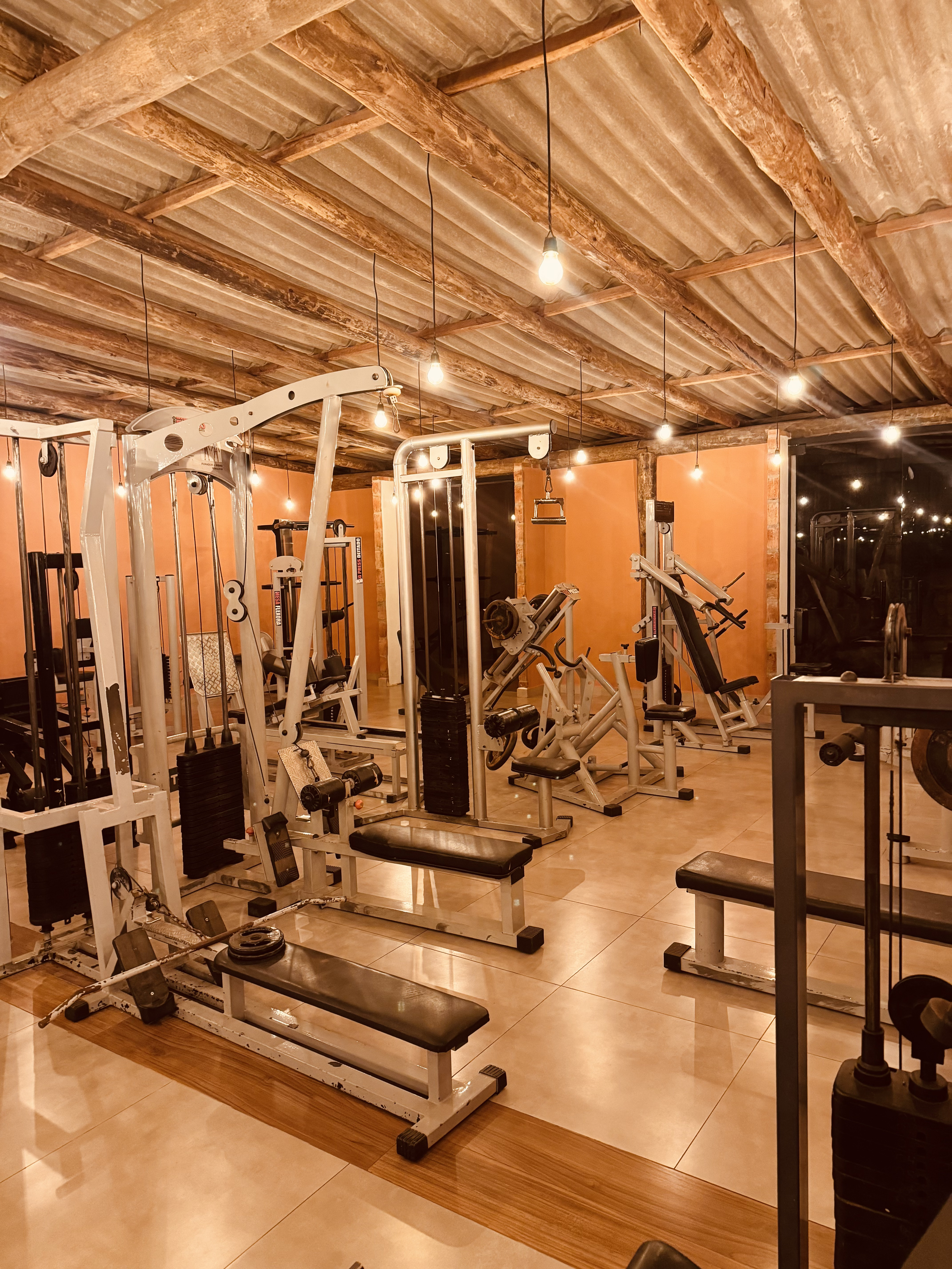 Academia equipada com equipamentos modernos e vista panorâmica.